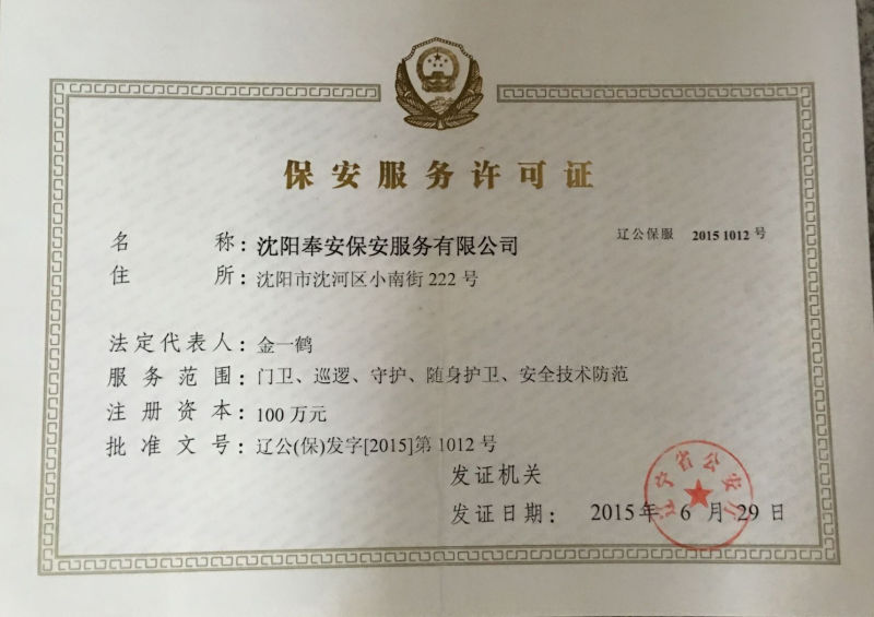 沈陽奉安保安服務(wù)有限公司(原沈陽市沈河區(qū)保安服務(wù)公司)創(chuàng)建于一九八八年八月,是遼寧省公安廳、沈陽市公安局批準(zhǔn),工商行政部門登記注冊(cè),全市首家具備保安資質(zhì)的特殊性服務(wù)企業(yè),隸屬于沈陽市沈河區(qū)政府直管的全民國(guó)有企業(yè),現(xiàn)為中國(guó)保安協(xié)會(huì)會(huì)員單位和省保協(xié)、市保協(xié)常務(wù)理事單位:在全市同行業(yè)中率先通過ISO國(guó)際質(zhì)量認(rèn)證,是市工商局批準(zhǔn)的“重合同守信用”免檢單位和沈陽市政府采購中心保安服務(wù)項(xiàng)目重點(diǎn)競(jìng)標(biāo)單位;擁有一支專業(yè)化、標(biāo)準(zhǔn)化、職業(yè)化的高素質(zhì)保安隊(duì)伍,是公安機(jī)關(guān)重要的輔警力量。